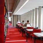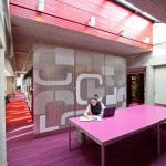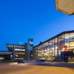 Encased in glass, old is presented as new. Glazing and metal sunshades convert the “energy monster” into a sustainable benchmark while responding to existing building rhythms. Once hidden and uninviting, the front door become a transparent gateway animated with activity. Bright colors and bold patterns from the original palette were reintroduced as super graphics, textiles, and furnishings to differentiate service and learning environments.