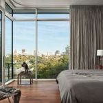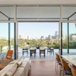 The renovation essentially turned the house sideways, opening the living spaces to the eastern city views which previously was only visible from the a side porch. A hint of this orientation is apparent from the front, where the steel frame of the screened box that extends from the living room can be seen extending onto the side porch. “It marks the point of collision between the old and new on the exterior, an intersection that is at once startling and perfectly logical,” adds LaRue. The homes main level houses all the bedrooms and common living areas with two sets of stairs that connects to two new spaces tucked under the house — the garage at one end, and the new exercise room at the other. The living, dining and kitchen are an open space with floor-to-ceiling glass walls that opens to the sparkling infinity pool and terrace – one of the main focal points of the home. A custom wine display shields the stairs that leads from the kitchen to the garage. The stairwell walls are lined with laminated Life magazine covers retrieved from the original basement, celebrating the homes endurance and longstanding history. Architects James LaRue and associate Emily Hayden used three-dimensional architectural modeling to create a virtual walk-through that allowed the Sharplins to evaluate the exact views from each room by specific time of day. In the public spaces, ten-foot tall and six-foot wide sliding doors and four-foot transoms are accommodated by a structural system that obviates the need for large headers with the soffit lifted to further expand the view, and a clerestory window wraps around the corner at the kitchen, introducing southern light into the space. Loewen Windows and Doors, the manufacturer of the timber frame curtainwall, was an essential collaborator in creating the operable wide-open glass frontage that smoothly merges inside and outside and enables the dazzling, uninterrupted view.