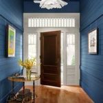 Additional historic details include art rails in the shiplap entry hall alongside reconstructed traditional windows that reside with the original side lights which frame the new entry door. The deep blue of the entry opens to a modern soft off-white of the modern spaces. Doors to a bedroom and office (two of the home’s original spaces) flank the entry hall but are completely concealed in the walls, streamlining the procession that moves visitors from the traditional to modern spaces that appear unexpectedly at the end of the foyer.