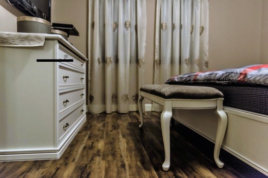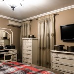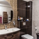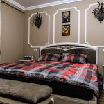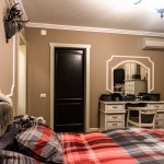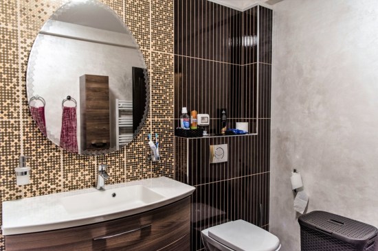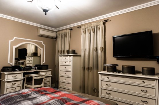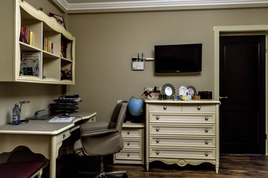For the bedrooms, the choice was made of white wood furniture; in contrast to the walls, tapestries and decorations used. Thus, in the matrimonial bedroom we find a bed with white wood structure and upholstery made from the Milk velvet, bedside tables and a dresser with drawers; but also a toilet for makeup and a tower for storage. The bed is completed by a decorative banquet, which has the same finishes as this one. The matrimonial bath, keeps chromatic, being finished with decorative ceramic tiles in shades of brown and cream, with golden accents. The children’s bedrooms retain both the style and the color of the matrimonial bedroom. The beds chosen for the children’s bedrooms are upholstered with removable textile material – so they can be easily washed and cleaned. Children’s bathrooms are the most colorful rooms of the house, coming out of the classic, very elegant style. For these, a different approach was chosen; more personalized to their age. Thus, the girl’s bath proposes shades of dusty pink and light cream – with floral accents; and the boy’s bathroom was designed in turquoise and beige tones – with abstract geometric accents.