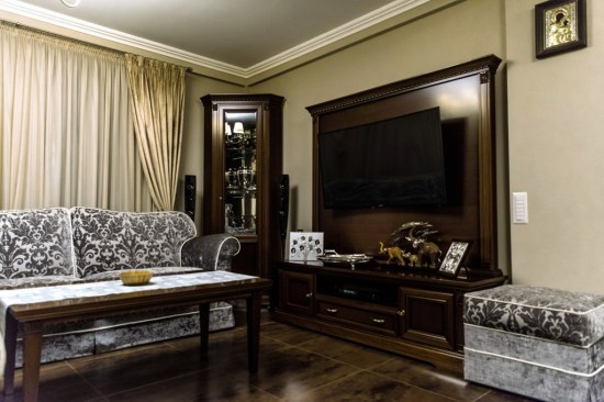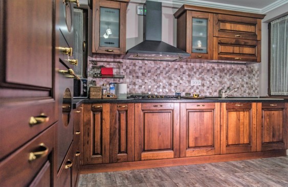 With a built area of ββ340 sqm, the house is arranged on two levels, ground floor and floor, but also benefits from a partial basement – in which was created the entire technical area of ββthe house, but also the laundry and the drying room. On the ground floor, we find the living area of ββthe house. Access is through a spacious hall, which will introduce us to the whole atmosphere of the home. Very elegant ceramic veneers, walnut furniture, decorative cornices and wide baseboards are some of the defining elements of this home. The living room, which also includes the dining area – preserves the ceramic floor – for which it was decided due to the underfloor heating. In the living room we opted for a set of sofa and two large armchairs; with classic design and upholstery in embroidered textile material.