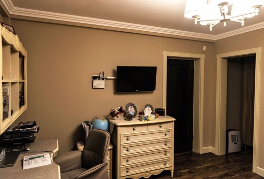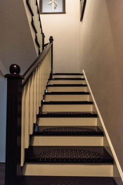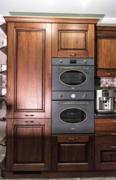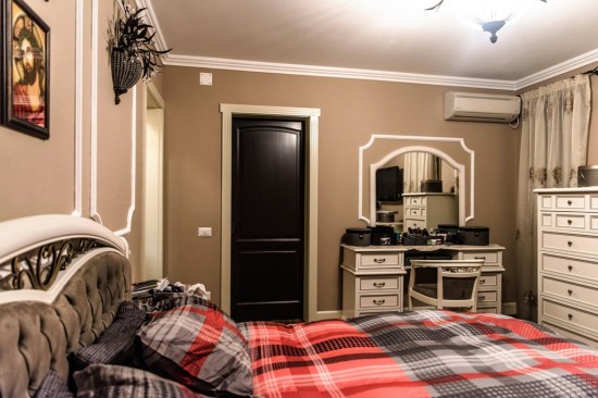The closed kitchen was the ideal solution for this family. The kitchen also has a large room attached – to provide space for the necessary storage. The kitchen furniture also made of walnut, was designed to fit perfectly into the room – offering plenty of storage space and perfectly incorporating all the necessary appliances. Due to the large enough space, in the kitchen was also placed a family table, with 6 chairs. The first level of the house also includes an office, a bathroom, but also a guest bedroom. The access to the floor is made on a scale made of walnut and white wood; combination for which it was chosen to preserve the elegance and refinement of the classic style, but also to open the house of stairs that do not benefit from much natural light. Upstairs, we will find three bedrooms, each with its own bathroom and dressing room. Access to each of them is through an airy and spacious hall.