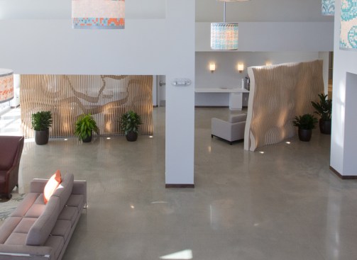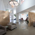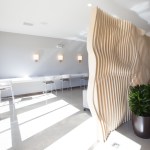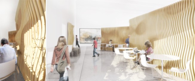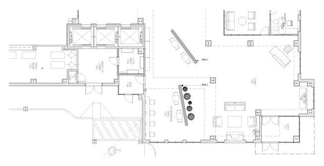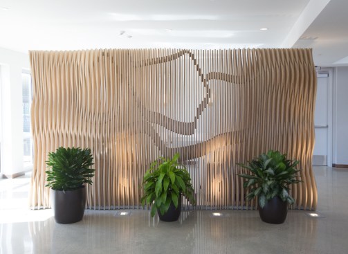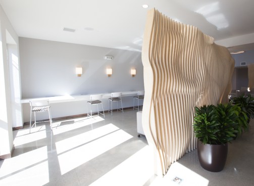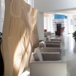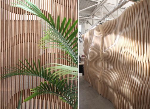 With the provision of a casual description and partial floor plan of the lobby and adjacent networking cafe, Radlab was asked to create an interior installation composed of two slatted walls. Knowing the dimensional constraints of the walls (8’ tall x 14’ long), our design strategy began with a preoccupation in the role of a wall as an architectural tool, fully circumscribed by open, public space, yet capable of creating moments of privacy.