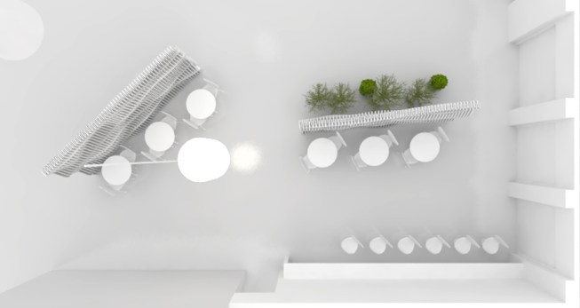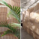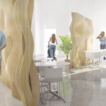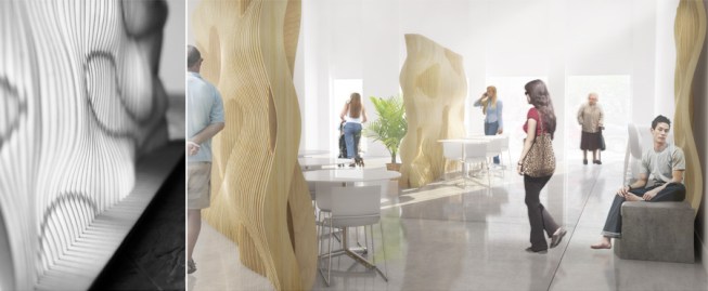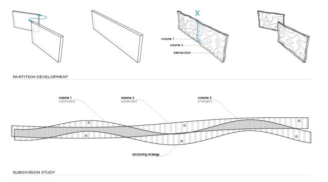 Slats are extracted in an alternating fashion by each of the two interpenetrating volumes. The intersection of these wall geometries creates an interference pattern from which a third, immaterial volume emerges. It is within these boundaries of intersection where nodes of connectivity are dynamically revealed and concealed based on the occupant’s point of view.