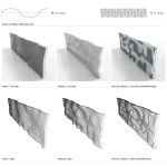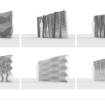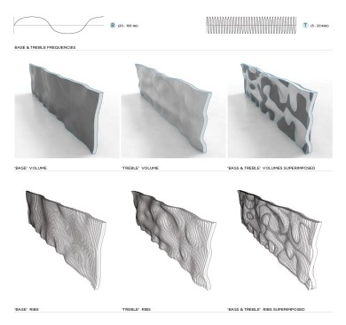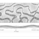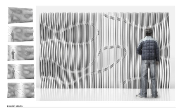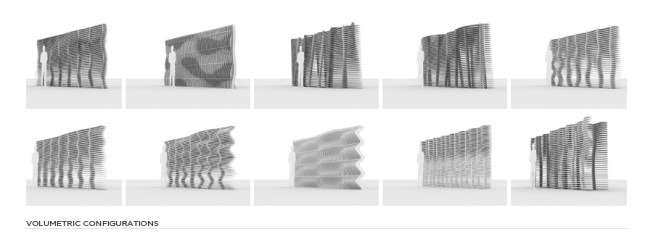 We began looking at the effects of moiré patterning in volumetric configurations. In order to achieve a compelling moiré it became clear that each of the two walls would essentially be defined by two interpenetrating volumes, segmented into vertical ribbing. It seemed fitting, then, to first combine the walls, and view them as one continuous partition that would be separated only after completion of the .