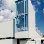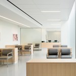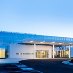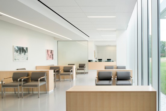 The new facility echoes the palette and materials of the existing health center but creates a subtle point of departure in the modularity of both the opaque and transparent portions of the enclosure screen. This soft differentiation ensures a compatibility and homogenous expression between existing and new construction, but provides a readable distinction, announcing to visitors that they are functionally different structures. The ample, north east facing, floor-to-floor glazing on the primary street façade allows visibility to visitors of the waiting areas within; this is intended to promote ease of wayfinding and also to alleviate anxiety in visitors by means of exposure to light and activity within the building envelope.