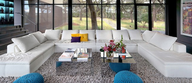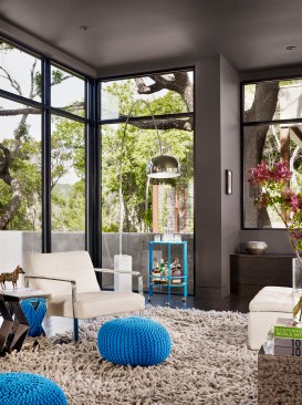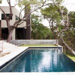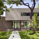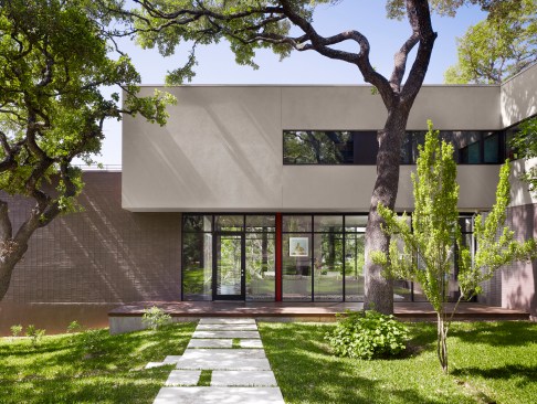 The primary mass of the house was lifted off the ground plane by creating a series of masonry walls that extend across the site to form interior and exterior rooms that frame views with the Live Oak trees beyond. The walls define family spaces on the lower level, while supporting a “floating box” of bedroom and private spaces above.