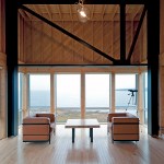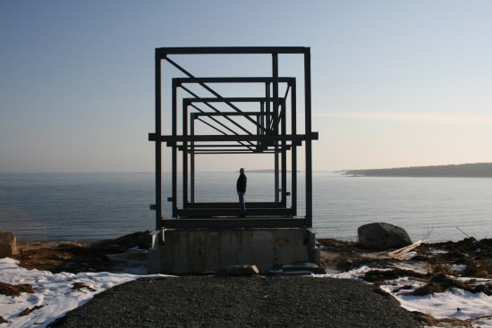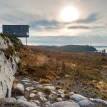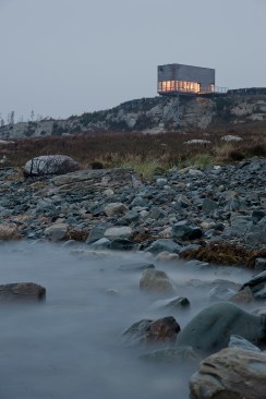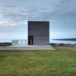 This modest project is first in the series of projects to be built on a large (455 acre) property on the Nova Scotian Atlantic Coast. It acts as a didactic instrument intended to heighten the experience of ‘dwelling’ in landscape. A pure, austere wood box is precariously perched off the bedrock cliff, ‘teaching’ about the nature of its landscape through creating a sense of vertigo while floating above the sea. This strategy features the building’s fifth elevation – its ‘belly’. On approaching the cabin from the land, one is presented with a calm wood box with its understated landscaping, firmly planted on the ground, in contrast with the subsequent dramatic interior experience of flying off a cliff, like the local fishing sheds.