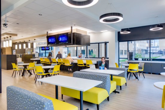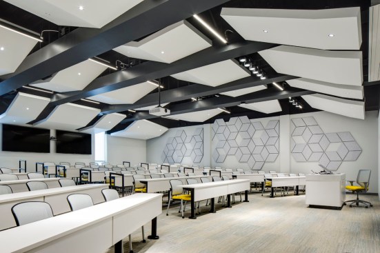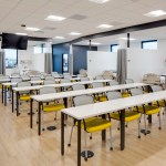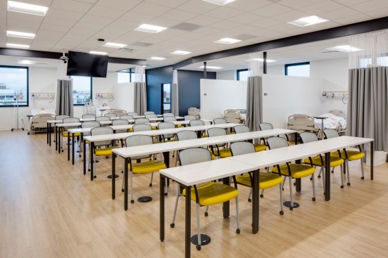 The building also includes: Early childhood education classrooms, distance education classrooms, specialized therapy rooms, a nursing simulation lab, a hydrotherapy pool, gymnasium for physical therapy, audiometric booths, a café, a teaching kitchen, and an underground parking garage.