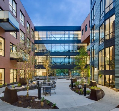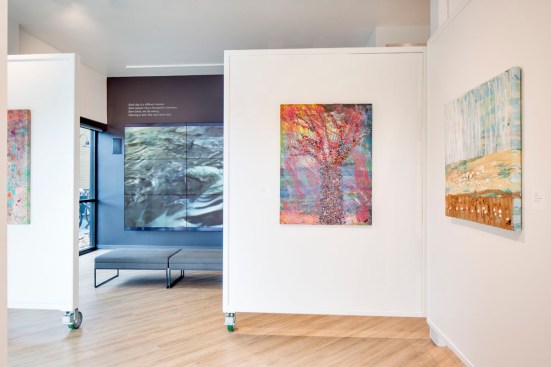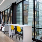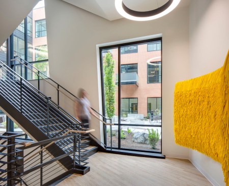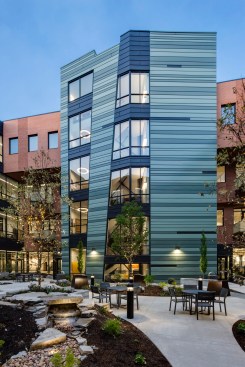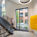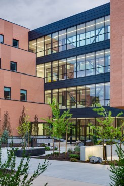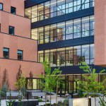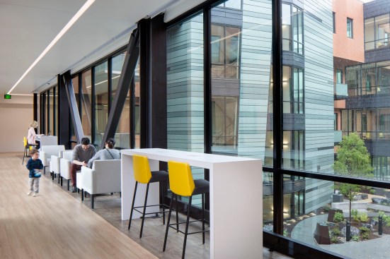 The building is a four story, 100,000 S.F. building with a 10,000 S.F. underground parking garage. It is divided into two wings, one which contains more academic/research functions for faculty, students, and the public; and one which contains more clinical spaces for patients and private therapy. These two wings are connected by transparent bridges, with a large open-air courtyard between. This courtyard serves as the heart of the building and is named the “Healing Garden.” It is a multi-functional space for patients to get fresh air before or after their treatment, or a space for students and faculty to sit outside and eat food from the cafe in the main lobby. The main lobby also contains a gallery designed to host exhibitions every few months.