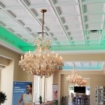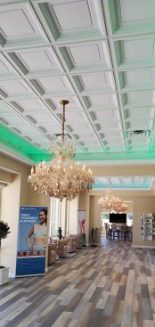 Cloud 9 Medi-Spa, a new luxury medical skincare clinic in Southern California’s burgeoning Inland Empire, wanted to project an image of elegance, epitomized by the crystal chandeliers in its reception area. Instead of the usual flat ceiling tiles, they installed decorative ceilings made of three-dimensional Ceilume thermoformed panels. The lightweight white Madison and Stratford styles complete the statement started by the chandeliers, and provide an instant aesthetic upgrade to the rooms.
