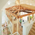 The new house’s skin and structure wrap the old wooden structure like a piece of cloth covering the building’s skeleton, creating a blurry space between the new and the old. The starting point of The Clover House is the signature pitched roof. This repurposed element creates dynamic interior spaces, and recalls the owners’ memories of the building as their home. The form of the house brings to mind a magical cave or a pop-up fort. Compared to the original assembly-line residence, the new three-dimensional wooden structure presents a much more organic and dynamic form to host the kindergarten. The facade and roof utilize common soft roofing materials, such as asphalt shingles, to provide waterproofing, while wrapping up the whole structure in a sheath of paper-like pieces.