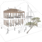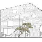 Located next to rice paddy fields, the Clover House’s form brings to mind a mystical cave and a pop-up fort. Compared to the original assembly-line residence, the new 3D wood structure presents a much more organic and dynamic form to host the kindergarten. The facade and roof utilize common soft roofing materials asphalt single to provide waterproofing, while wrapping up the whole structure in a sheath of paper-like pieces. After the building is completed, each piece of “paper” will become the canvas for children to draw and create on, extending their memories of the Clover House.