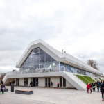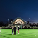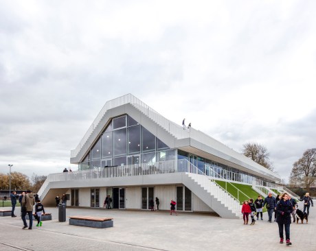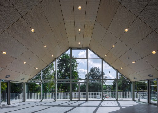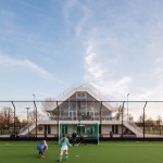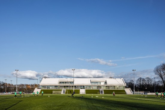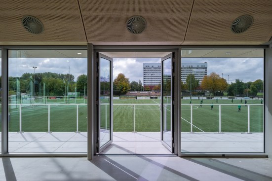 On top of the green embankment a transparent pavilion is placed with bars and offices and meeting rooms with a panoramic view. The terrace over the full perimeter of the building has superior view over the playing fields.