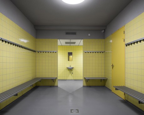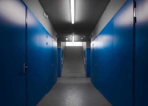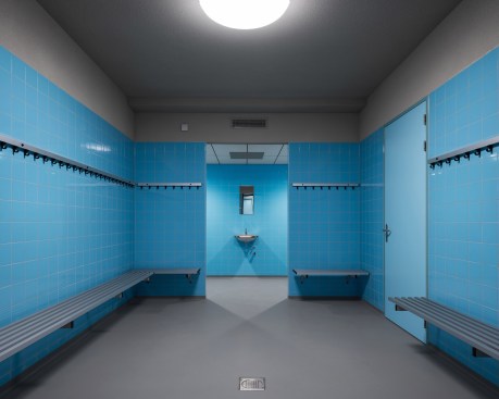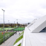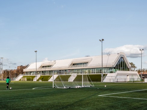 The façades of the changing rooms -unattractive by nature- are hidden behind a slope. This ‘dyke’ is clad with Astro Turf to blend in with the surroundings that, as most pitches these days, are also covered with artificial grass: the fields ‘curl up’.