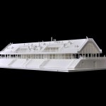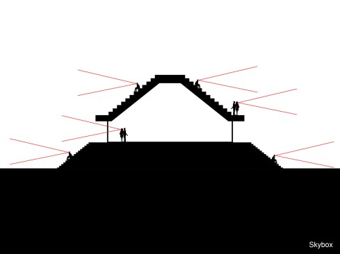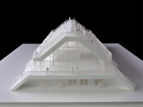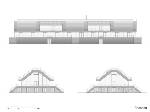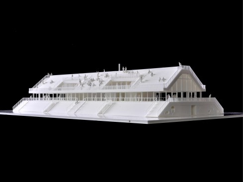 The club house is topped by a pitched roof: a kind of stepped gable* that is extruded over the entire length. The roof becomes habitable, accessible: a two-sided grandstand comes into being that fully capitalizes the characteristic orientation of the playing fields.