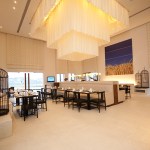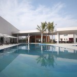 The first block from the entrance contains the reception area along with recreational facilities such as the multipurpose hall, a board room, spa, a juice bar and a gymnasium, all planned in a two-floor volume of the building complex.