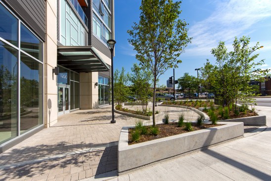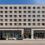 This new mixed-use, mixed-income development respects both the immediate traditional and the minimalist industrial character of its context. The base of the building is glassy and open with contrasting colored precast concrete panel ribbons that define combined volumes of interior space. The body of the residential floors appears to be lifted off the base and is defined by conceptual book covers that hold both street walls. The facades feature a staggered pattern of alternating sized precast panels which appear layered with contrasting textures creating a sense of dynamic movement and activity. Window units include a colored accent panel that plays up asymmetry, alternating orientation from floor to floor. The primary street walls accentuate the acute angle of the site and the conceptual spine of the book contrasts to glazed end walls. These two volumes are gapped by a ‘slot’ anchored by a glass feature and canopy, emphasizing the central axis of the plan and serving as a backdrop to the articulated corner plaza.