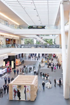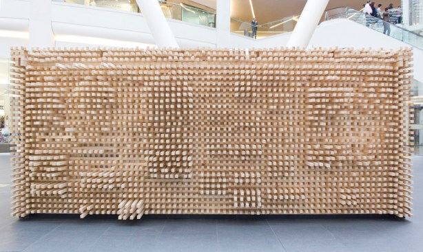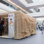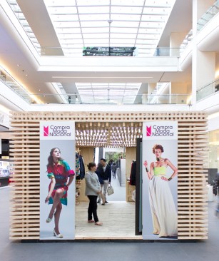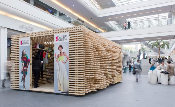 Compra Moda Nacional Pop Up Store is made out of 5,000 wooden parts. It is an example of ephemeral architecture inspired by pin art hence its form and arrangement of assemblies allows reading outside in the piece.