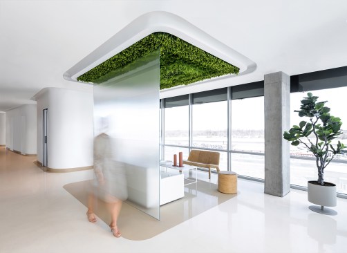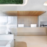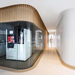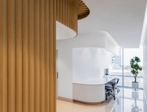 This tenant improvement project had an existing conventional double-corridor workspace layout. Small cubic offices defined the space perimeter with a dark lengthy corridor as the main space circulation. While adhering to safety codes, the improvement focused on the renovation of this main circulation corridor as the Clinic Promenade and to revisit the integral need of this most-used common space to counterplay with the solid offices. The project took an urban design approach to a scale quite smaller in size. Programs of the clinic were divided into groups as a sequence of the promenade experience. This experience started with the reception space, in which fixed opaque enclosures were maximally avoided. Defined by soft partitions, informal furniture layout, and indoor landscaping, the reception area brings an overlook of the entire operation and the clinic’s vision for health to the visitors. Against the reception is the milling room with a curved transparent visage, which is occupied by the milling machines to produce dental models for the clinic. This room is fed by an intense lab that is accessed from the back corridor and separates the visitors from the technicians and machinery that operate the facility. Similar to the functioning of an elegant watch, the visitor’s window into this world is a curved glass, framed by a wooden bed of birch plywood strips. To enliven the promenade, cross paths were introduced between office peninsulas to not only enhance the corridor experience with natural light and gleaming views of the developing cityscape below, but to separate surgical spaces for better sound isolation. The corridor was also utilized with every possible function. At the corner of the promenade are functions such as the nurse station, sterilization room, crash cart room and dental cart parking, all of which define secondary common spaces that break the linear experience.