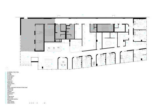 The integral driving force of a new architectural scheme for us is always the balance of its functionality and aesthetics. Instead of discontinued construction artifacts or trendy material palettes, which is widely utilized in the workplace and healthcare interior and tenant improvement designs, when initially envisioning the potential of the project CO00, the goal to set a new spatial experience for the client and the patients, to create a streamlined yet breathable healing space, to not only keep high efficiency but incorporate psychological care for the patients and relieve potential anxiety that is associated with a conventional surgical facility.