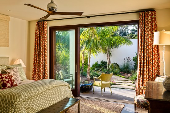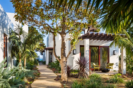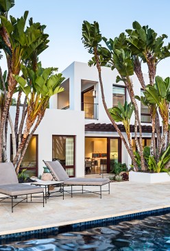 The challenges were to create a comfortable home with a feeling of spaciousness within the site constraints, and to blur the boundary between the two lots, connecting them for shared communal uses and opening views while maintaining privacy. The biggest gestures on the exterior were the removal of a plaster property line wall and the development of a lush, shared tropical garden that greets guests, leading to the separate entries for both homes. The new home was designed in the same bold yet simple modern style, mimicking the palette of materials and proportions, though scaled for the constraints of the smaller property. The design solution utilizes strategically placed openings in the solid mass to capture important views and connect with the outdoor lounging and entertainment areas. In keeping the palette of materials and colors simple, the living spaces feel far more spacious than their footprints reveal, creating zen-like interiors. The bold plaster exterior is warmed with stained mahogany doors, windows, and trellises. Concrete floors and simple white interiors punctuated by warm,