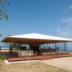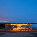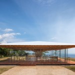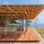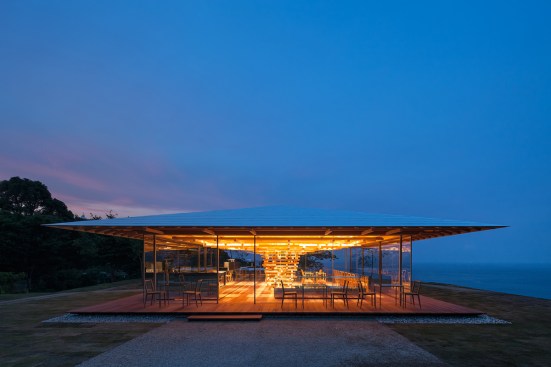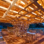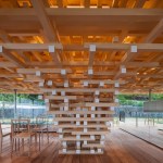 Randomly stacking 8cm square cedar boards, we made a huge tree-like structure. Reinforcing with a carbon fiber rod (with a tensile strength 7 times that of iron) it becomes possible to have a single trunk with large branches while still diminishing movement during earthquakes. The site lies on a cliff overlooking the Pacific Ocean, and due to the tree-like form, we were able to eliminate columns at the perimeter which would otherwise obscure the landscape.