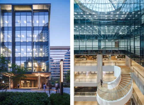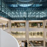 Two V-shaped fourteen storey office towers cut into the surrounding urban environment at a 45 degree angle. They are linked together by the central square shaped complex, creating a structure with sharp corners and a strong sense of geometry.