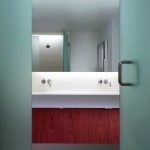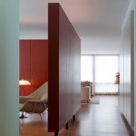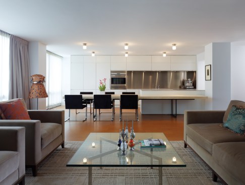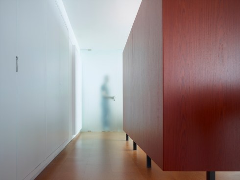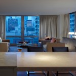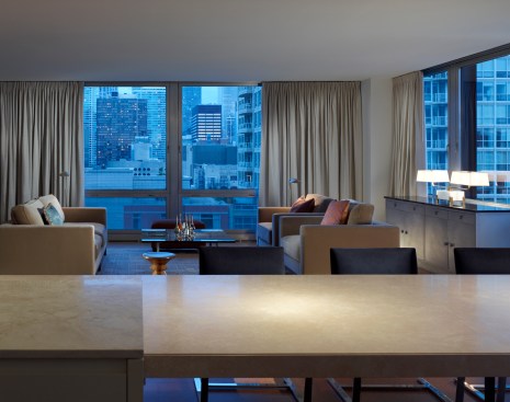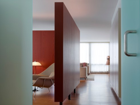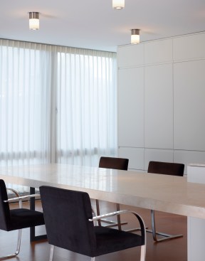 Located in Ludwig Mies van der Rohe’s landmark 860 Lake Shore Drive building, the design objective was to transform a three-bedroom apartment into a spacious one-bedroom while maintaining the Miesian detail and influence of the building envelope throughout the space. Through removing interior bedroom partitions, the apartment received increased natural light and panoramic views of the city. Translucent glass panels divide the bedroom to further add dimension and natural light, and custom millwork and cabinets create an atmosphere of spaciousness while also providing precise function. The custom dining table is constructed of travertine marble, homage to the stone of the building’s lobby and plaza.