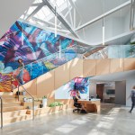 Upon entering the lobby, a custom mural, painted by Ceasar Perez, provides a reception area background and links the two levels at the main, open stair.