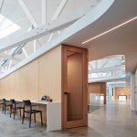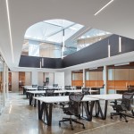 All of the custom millwork, made from rift sawn white oak, including the staircase, planter boxes, office pods, tables, and workstations, was designed and constructed in Chicago. The free-standing workspace tables are constructed of a quartz top and a steel base. The design inspiration for the bases is inspired by the timber trusses’ structural geometry above, linking vernacular architecture of the existing building to the interior design.