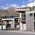 The structural system is wood frame construction, with steel post and wood glulam beams for the second floor and roof framing, and tube steel post and c-channel structural elements for the stairs and decks. Stairway treads are constructed of steel bar grate and handrails of metal mesh. Durable interior and exterior finishes were selected in anticipation of a high level of usage by rental occupants. The exterior materials include fiber cement siding panels, 18 gage hot-rolled sheet metal, and corrugated metal panels in several complimentary finishes installed in a rain screen application. The thermal envelope includes 1-1/2” of rigid foam insulation with radiant foil on the exterior, and spray foam inside the stud cavity. Each unit also includes a gas fireplace, radiant heat in the concrete floor slabs, and a washer/dryer. Maple cabinetry and doors and vaulted ceilings with birch veneer plywood that extend outside to also become the soffit material bring warmth to the interiors. The landscaping consists of drought-tolerant grasses and plantings to promote water conservation and blend harmoniously with the high desert surroundings.