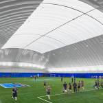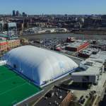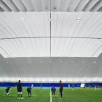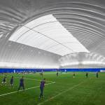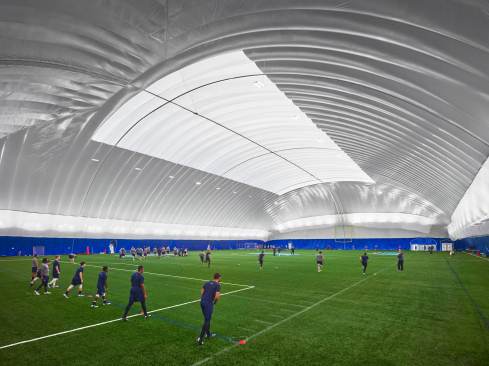 Erected in November and decommissioned in March, the seasonal structure is anchored to structural grade beams embedded below the surface of the field and supported by an integrated cable grid. The opaque fabric vinyl membrane is held up by a slight positive air pressure created by dedicated air handling units located adjacent to the field. The seasonal structure also includes multiple access points with air locks to maintain positive air pressure when in use.