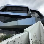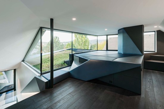 Following the slope, the light-flooded residential “CoMED” building develops in a crystalline, conspicuous shape. Similar to a ski jumping facility, the Residential as a compact living space sits on the slope of its habitable outdoor areas and projecting swimming pool, similar to a jump-off platform to the downhill garden area.
