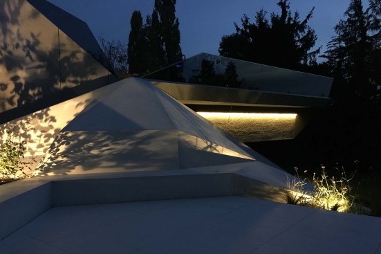 For merging garden with the folded facade on the hillside of the plot, the "garden folding" in white was created: Made of glass fiber concrete panels, this functional object fit the outdoor living area for habitation with their different features:
