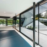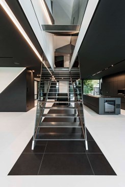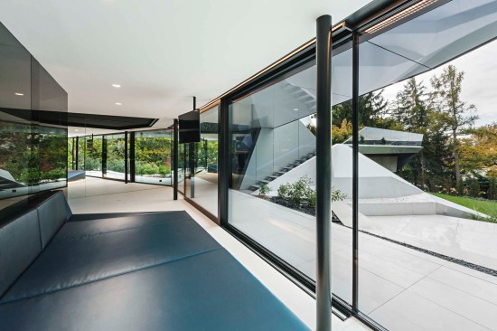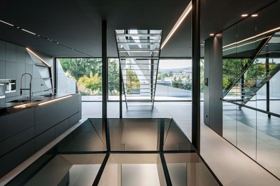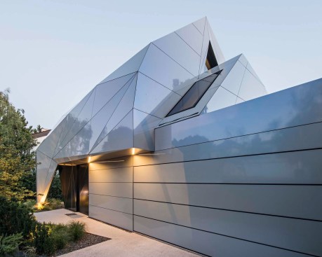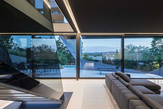 Basement and pool are made of concrete and the overground areas are made with steel skeleton and KLH wooden building elements with a dress of aluminum composite panels, reflecting on the weather. The building envelope develops along the street as well as on the garden side up to the adjoining horticultural terrain level.