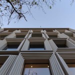 The building is designed as a contemporary and sophisticated structure, with a detailed, attractive façade. The façade, developed in layers of laminam, is fashioned as a series of glass appended stone frames that double-up as display windows – allowing admission of ample natural light. Initially designed as 3-inch-thick stone blocks with multiple mouldings, the frames presently appear as flat blocks, given the floor-area-ratio restrictions within the area. The stone frames resonate perfect geometry within the building. What began as an exercise using the Golden Ratio, has evolved into a minimalistic, subtle, understated outcome with elements of beauty and intricacy.