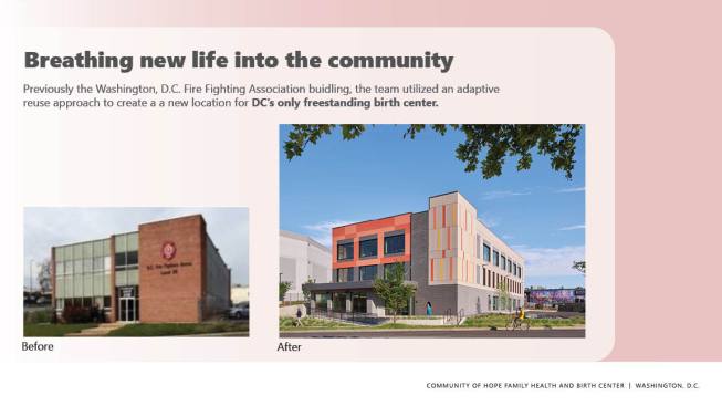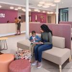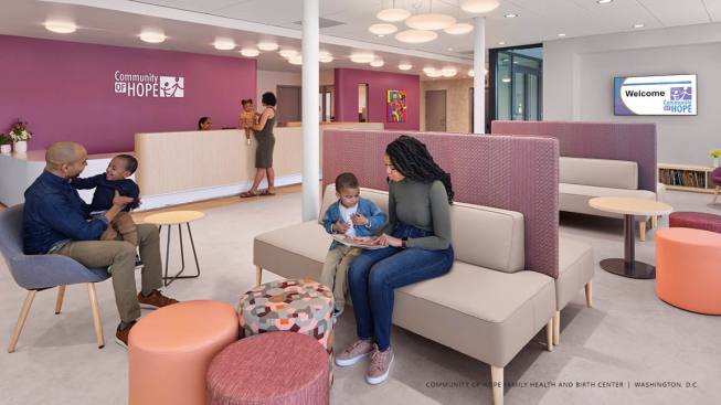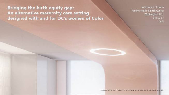 Developed to provide quality healthcare services for under-served communities, with an emphasis on expectant mothers and their babies, this center occupies a former 1960s office building in northeast D.C. Tapped to convert the existing building for this purpose, Gensler conducted extensive research through staff and community engagement events, discovery workshops with local families who experienced hospital and birth center deliveries, and by listening to personal stories about trusted relationships and how they made all the difference. What the design team learned is that the community desired a center where the care team was truly familiar with them beyond a name with an accompanying medical record and spaces that possessed welcoming qualities and comfort. The designers also learned that community members preferred an aesthetic of softer palettes, pops of color, and complex patterns and thus strove to incorporate these within programming parameters such as exam rooms, staff workspaces, and a large multipurpose space.