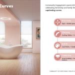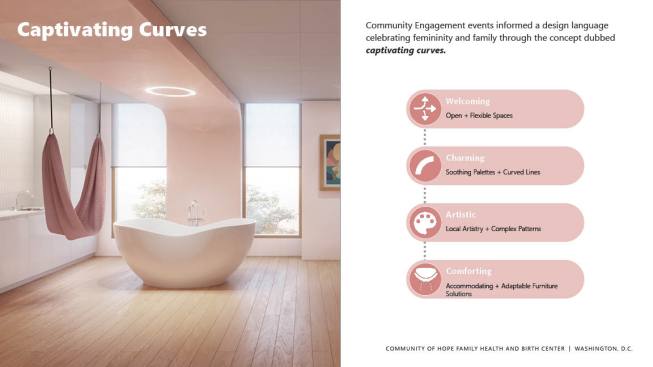Gensler responded with soft, curvaceous, and inviting spaces and individual elements. For instance, in the reception zone one encounters a curvilinear check-in desk; round ottomans, tables, and light fixtures; rounded wall corners; and a palette of neutral tones with pops of soft magenta, peach, and lilac. Taking community feedback pertaining to the birthing suites to heart, the team ensured the rooms were devoid of anything that appeared remotely clinical. Once again, curvilinear elements appear as rounded corners on walls, ceilings, and even at the floor level, while furnishings are more reminiscent of home with pieces such as a rocker, a wooden dresser with a changing table on top, and a luxurious freestanding soaking tub with a floor-mounted filler. Even the bed looks like it’s been plucked from a home, its style that of a modern platform bed with a railed headboard.
