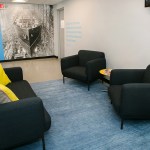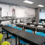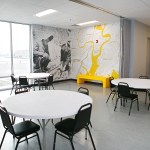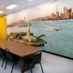 The new CRC, housed at 9 Basin Drive, will be unique to other NJRC sites, specifically working with individuals who are on parole. Overlooking the Hackensack River, the CRC features colorful wall-to-ceiling photographs, graphics, and quotes with historical and cultural significance. Among the visuals are the Statue of Liberty, historical photographs of South Kearny and its ship workers, Rev. Dr. Martin Luther King Jr., and a map of Kearny Point and the surrounding area. The imagery and quotes are meant to invoke inspiration in NJRC clients as they reenter society and prepare for employment opportunities. All of the interiors were designed by WXY Architecture.