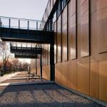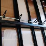 The team developed three types of functional cladding for the project. At the main boathouse, an assembly of composite panels with operable vents allows for natural ventilation. Patterned louvers on the south face mask mechanical vents, offer privacy for locker rooms, and induce natural cooling. At the adjacent sculling pavilion, glass shingles—held in custom extruded and fabricated aluminum clips—protect, ventilate, and display the smaller boats.