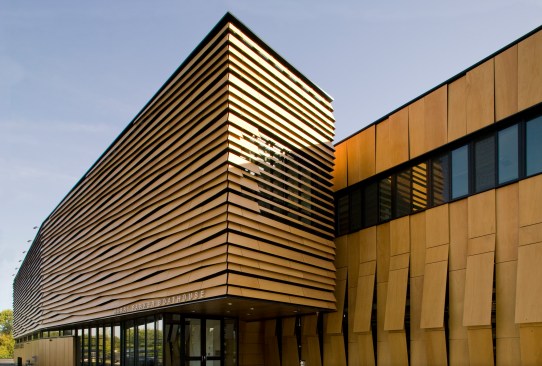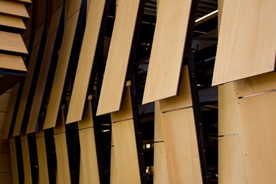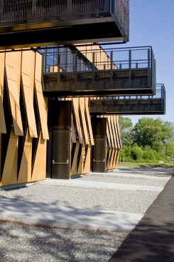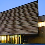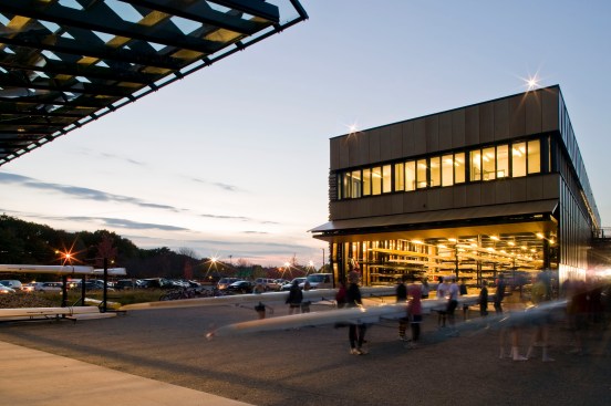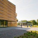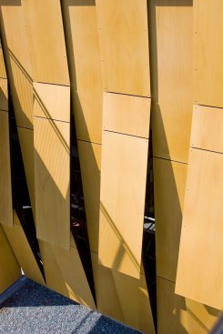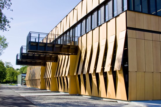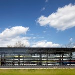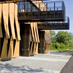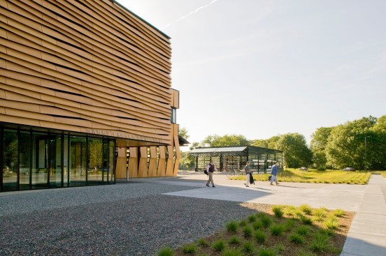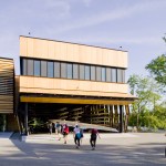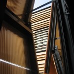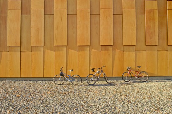 The main building’s skin is comprised of composite panels of phenolic resin and wood veneer, and is durable, lightweight, and natural. The panels operate as louvers, opening and closing to naturally ventilate the boat storage and provide both functionality and energy efficiency. The louver system is also highly iconic of New England’s traditional covered bridges and tobacco barns, reflecting their proportions and cladding, and anchoring this new building more strongly to its environment.