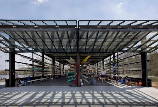 The main building holds four-person and eight-person shells on the ground floor, and contains administrative offices, and coaching and weight rooms on the second floor. The “core” of the building — stair, elevator, mechanical, boat repair, and locker rooms — is a sidecar volume whose separation from the primary spaces allows boat storage and support space to be open and flexible.