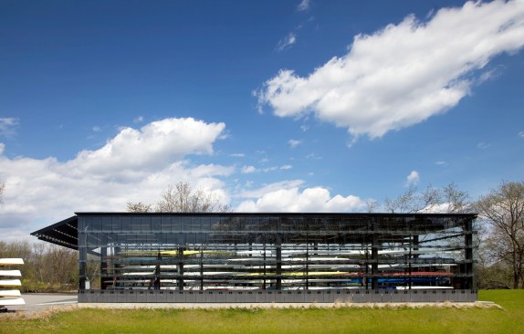 This facility is composed of two buildings that form a common space between them, creating both a gateway to the river and a staging terrace for the boats. The smaller of the two buildings is a glass pavilion for the single shells. Its transparency allows for a unique perspective on the boats during storage and can be viewed from the adjacent footpaths and roadway.