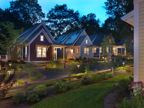 Thoughtful site-planning focused on small footprints oriented to optimize solar gain, storm water management through low-impact development techniques, and permanently protecting over 50% of the land as open space. To meet Net Zero energy standards, the project uses a combination of active and passive strategies and integrates high-performance building technology, including ultra low-energy building envelope assemblies and mechanical systems.