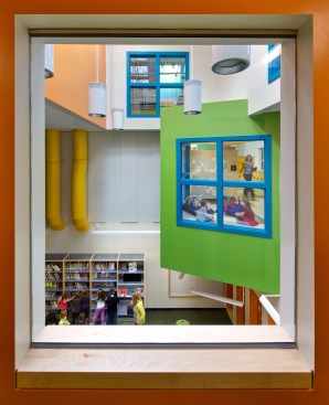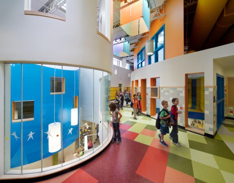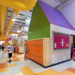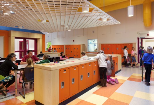 In place of traditional libraries, the resulting program features a multi-use Learning Corridor, public spaces that weave through the schools just outside classroom doors. These spaces, designed for flexibility, integrate project-based learning into the daily curriculum, with discrete spaces for media presentation, performance, quiet individual learning, and small group projects, as well as Wi-Fi access throughout. Because every classroom in the academic wing also has a window looking out onto the learning corridor, teachers can easily supervise and observe student groups both in the classroom and in the open project areas. As the heart of the school, the learning corridor promotes collaboration between students and educators; maximizes technologies; and creates opportunities for interdisciplinary and inter-grade learning.