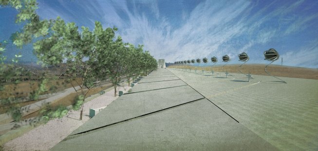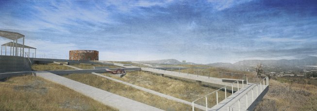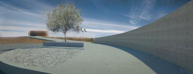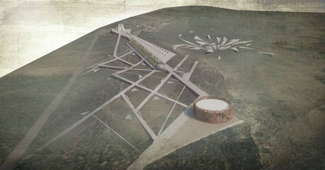 The aim of the proposal, was by entering the space, the visitor to perceive a strictly defined path, linear, upright and distinct, which introduces him in a ceremonial march of paying tribute, strongly signaled by its loneliness and its characteristics: The first remnant of the explosion, raises with its robust presence; becomes the first reflection of the destruction and marks the beginning of the final straight. The 13 sculptural ensembles, like physical presences of the thirteen heroes are lined up at angle, accentuating the perspective. Situated in proximity to the crater, looking the destruction in the eyes. At the same time, the visitor can have a different experience of things, as a necessary side of the same coin: 13 tense linear paths, start from different points of the basic path. Without order and consistency, intersect and involving in a destructive game with concentrations of remnants on fragmentary bases. The purpose of their existence is not functional; they are there to indicate the wandering, the panic and the tension, the exposure to the unwanted…