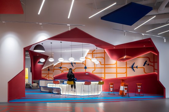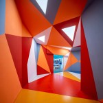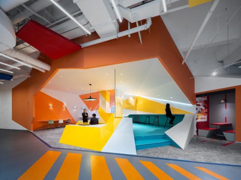 Young H Design, the architectural firm behind the project, took as its inspiration the client’s day-to-day business operations, which involve integrating digital and physical data on transportation into one online platform. The idea was to create a design language which is a balance between rigid faceted surfaces, representing the abstract network of coordinates connecting the virtual world of data, teamed with more gentle lines, which symbolize physical landscapes found within the natural world.