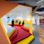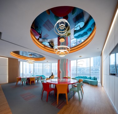 In contrast to this, the main operative areas feature a contemporary open-plan layout with panoramic windows and a selection of highly flexible transparent meeting rooms of differing sizes, which serve to engender an atmosphere aimed at fostering creativity. By making extensive use of modular furniture and flexible setups in the operative area, the newly designed office provides ample scope for increasing the number of employees. The architects have designed different spaces spread throughout the operative areas where employees can explore alternative approaches to holding informal meetings. These provide flexible, multifunctional areas that can be used for a range of different purposes. The strong use of themed graphics depicting different methods of transport to be found throughout the bar areas, together with the map of Shenyang along the corridor, aim to reinforce employees’ sense of belonging toward different departments within the company.