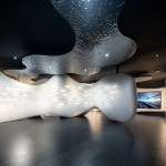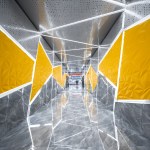 The lift lobby, and in particular the reception area, embrace and strengthen this abstract message. On the floor, the elegant shapes of marble recall ripples on the surface of water, forming a lake with the sculptured reception desk appearing suspended at its center. The smooth curved lines applied on the back wall portray mountains and are reminiscent of a traditional Chinese painting. By contrast, the digital cloud on the ceiling engenders the high-tech feeling and evokes the company’s work concerning transportation data, providing a strong statement about the company’s DNA, whilst providing guests with a warm welcome within this futuristic atmosphere.